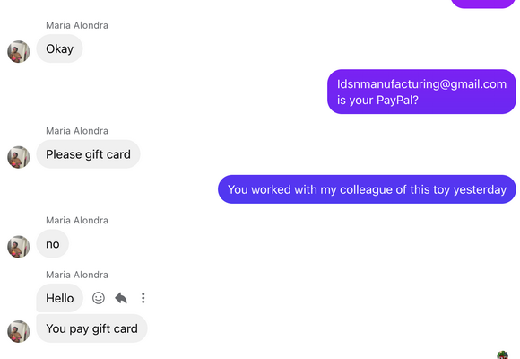 死不承认,一直叫我给礼品卡,一去查果然骗子,已经取消我同事订单了