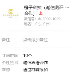 国家:美国 姓名:橙子科技(诚信测评合作) 微信号:du2002-1029 曝光原因和证据等: 大家擦亮眼睛,这个橙子科技服务商多个小号 ,不要合作,做的单子不返款!昵称是经常改,微信号一年了又会改一次,改个微信号到处骗人,名字写着诚信的往往是最不诚信的,微信联系不到人,已经失联一两个月了!骗子,死骗子,到处骗人钱,不负责任的服务商满世界飞,大家擦亮眼睛! 支持曝光() 被冤枉了()