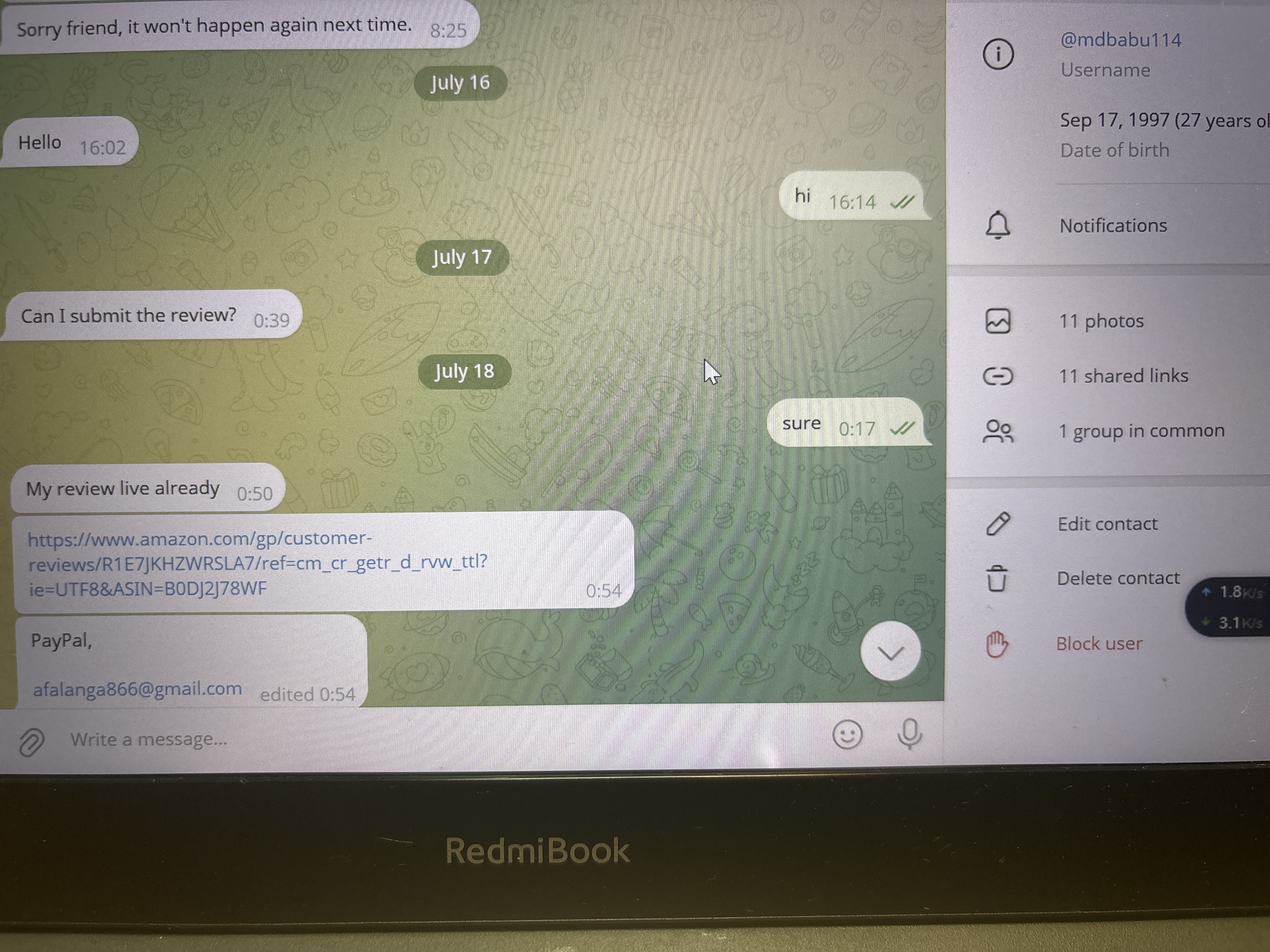 国家:美国 姓名:dailydisouning@gmail.com 邮箱:afalanga866@gmail.com Facebook主页:wahidmoral2022@gmail.com 曝光原因和证据等: 这是个骗子,两头吃 拿了买家的截图放过来然后发自己的pp 支持曝光() 被冤枉了()